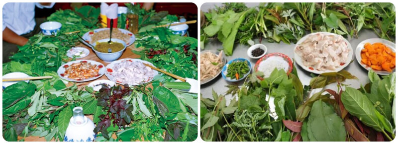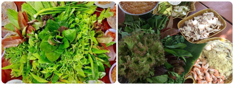Khi ăn, người ta chọn vài loại lá, không cần nhiều, xếp chồng lên nhau, thêm miếng thịt, con tôm, chút bì heo, cuốn lại bằng bánh tráng. Chấm sâu vào chén nước chấm rồi đưa lên miệng. Cảm giác đầu tiên là vị chát của lá sung, vị thơm của tía tô, vị béo của thịt, vị bùi của đậu phộng, tất cả được kéo lại bằng nước chấm đậm đà.