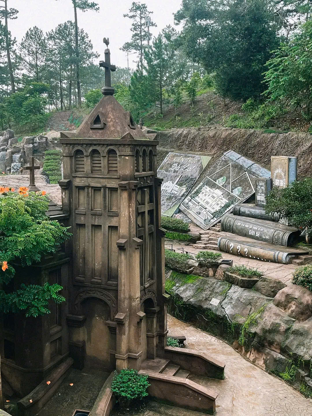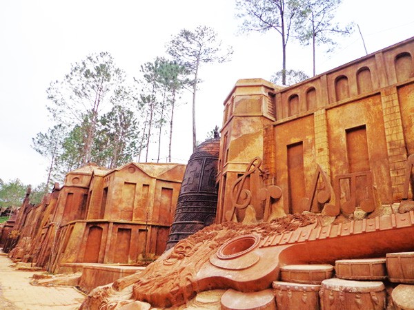 Điều đặc biệt là toàn bộ công trình không sử dụng bê tông hay xi măng,mà hoàn toàn làm từ đất đỏ bazan pha trộn phụ gia để tăng độ kết dính. Trên hành trình dài gần 2km,du khách sẽ thấy những công trình mô phỏng ga Đà Lạt,nhà thờ Con Gà,chùa Linh Sơn,thậm chí cả hình ảnh Việt Nam qua các thời kỳ. Đi giữa những bức tường đất sét đỏ,bạn sẽ có cảm giác như đang bước vào một bảo tàng điêu khắc khổng lồ ngoài trời.