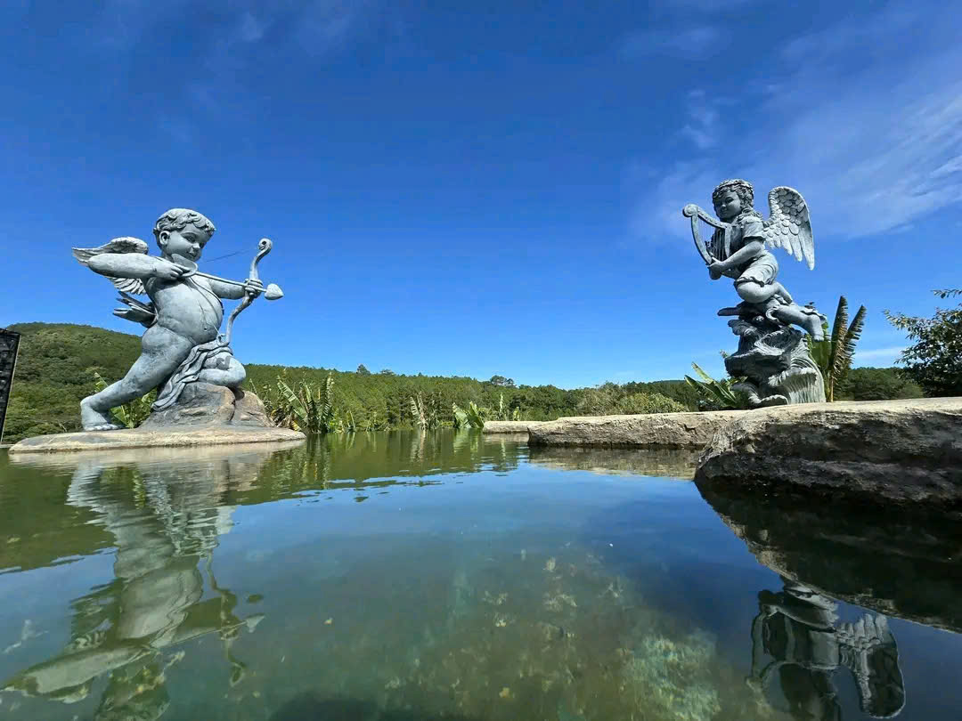 Khác với vẻ lãng mạn của Hồ Vô Cực,Hồ Thiên Thần lại mang sắc thái hiện đại và huyền bí. Điểm nhấn đặc biệt là đôi cánh thiên thần khổng lồ vươn ra giữa mặt hồ. Đứng giữa đôi cánh,du khách như hóa thân thành thiên thần đang bay lượn giữa mây trời và rừng thông. Hồ nước trong xanh,phông nền trời cao rộng tạo nên những bức hình nghệ thuật chẳng khác gì ở trời Tây. Đây chắc chắn là góc chụp “triệu like” mà giới trẻ không thể bỏ lỡ khi đến Đường Hầm Đất Sét.