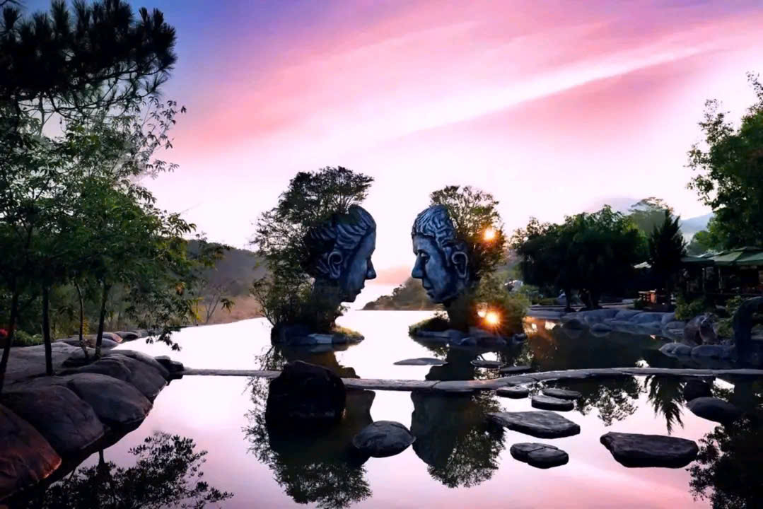 Hồ Vô Cực chính là “ngôi sao” của khu du lịch này. Giữa mặt hồ phẳng lặng là bức tượng đôi tình nhân khổng lồ Lạc Long Quân và Âu Cơ,hai nhân vật huyền thoại trong truyền thuyết Việt Nam. Khi ánh nắng phản chiếu xuống mặt nước,bóng đôi tượng hiện lên lung linh,mang đến khung cảnh lãng mạn và thơ mộng. Không chỉ là điểm check-in nổi tiếng,Hồ Vô Cực còn gợi nhắc về cội nguồn dân tộc,khiến bất cứ ai đến đây cũng cảm thấy bồi hồi.