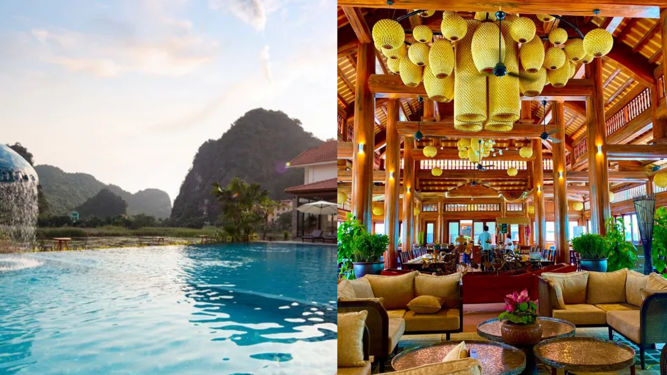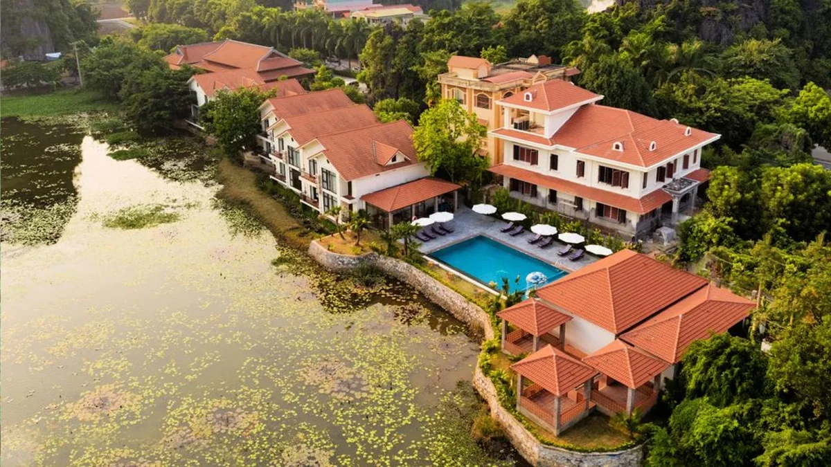 Điều đầu tiên tớ muốn nhấn mạnh chính là vị trí rất đắc địa của resort. Địa chỉ cụ thể nằm tại Đam Khê Trong, Hoa Lư, Ninh Bình, một khu vực vẫn giữ được nét hoang sơ. Nơi này không nằm ngay trung tâm ồn ào, náo nhiệt mà nép mình duyên dáng giữa những dãy núi đá vôi trập trùng. Chính sự tách biệt vừa phải này tạo nên một không gian nghỉ dưỡng lý tưởng cho những ai tìm kiếm sự tĩnh lặng.