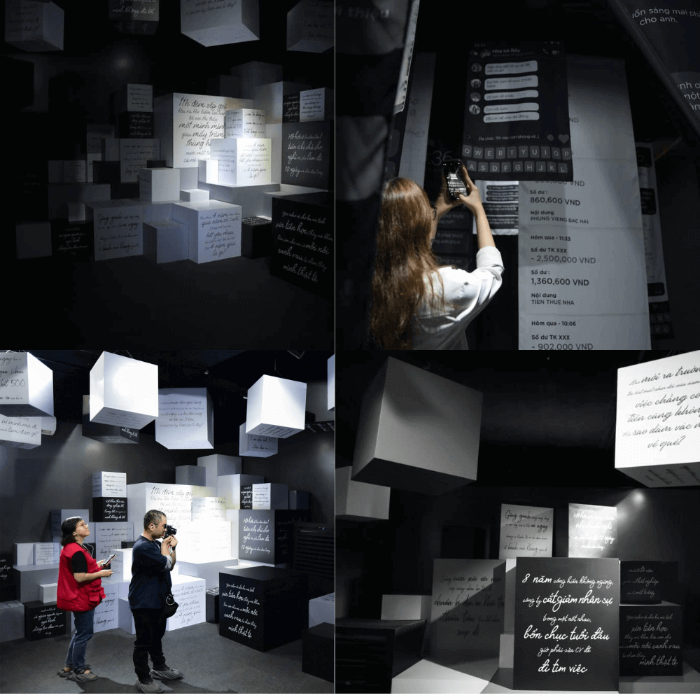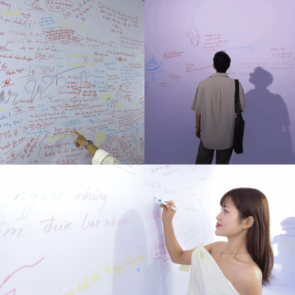 Ngay khi bước vào không gian đầu tiên,người xem lập tức cảm nhận sự bất ngờ và đồng điệu khi đối diện với những áp lực,khó khăn mà bản thân đã trải qua suốt một năm dài. Trong căn phòng trắng,những câu chuyện đời thường và tâm sự lắng đọng được khắc hoạ bằng những dòng chữ trên các khối đen trắng,tạo nên một không gian trĩu nặng nhưng đầy cảm xúc. Những khối hình trong căn phòng như phản chiếu những trăn trở quen thuộc,nơi bất kỳ ai cũng có thể thấy chính mình trong đó. Những tờ hóa đơn chồng chất cùng bao nỗi mệt mỏi mà mỗi người từng gánh chịu được tái hiện sống động,như những cú "vỗ" đầy đau đớn của cuộc đời,khiến ai nấy đều nhìn thấy chính mình trong đó. Hiệu ứng ánh sáng chớp tắt khéo léo nhấn mạnh thông điệp về những tia hy vọng mong manh bị lu mờ trước hiện thực khắc nghiệt. Điều đặc biệt ở cuối căn phòng này là không gian dành cho người xem ghi lại câu chuyện và tâm tư của chính mình. Đây không chỉ là dịp để giải tỏa và chia sẻ,mà còn là bước mở lòng,giúp mỗi người chuẩn bị sẵn sàng bước vào hành trình cảm xúc tiếp theo.